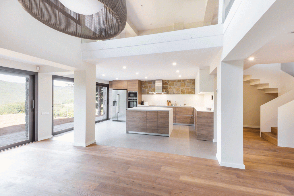 L’illa de la cuina amb mobles alts, de Santos, marca de la qual Boix Interiorisme és distribuïdor oficial, s’adapta a la llista de desitjos de crear una zona de treball, on poder-se moure i interactuar amb la resta de l’espai amb total naturalitat.