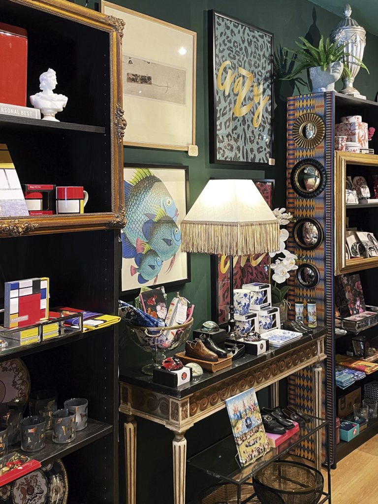 En sus muebles y estanterías rebosan velas y candelabros, jarrones, exclusivos artículos de papelería o stationery, como postales y tarjetas de felicitación, cuadernos, papeles estampados, cromos y accesorios para trabajos de scrap, collage y decoupage, vajillas, cristalerías, cojines, de sus paredes cuelga arte para todos los gustos y bolsillos, desde láminas decorativas de variadas temáticas hasta originales de Pierre Alechinsky o serigrafías de Lonel Moura.