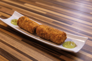 Croqueta de pollastre a l’ast amb un toc d’espècies del xef i gel de poma àcida. Molt cruixent!