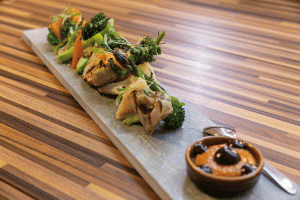 Verdures a la brasa amb romesco de tomàquet, ceba escalivada i all negre.