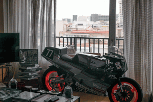 Lo que más llama la atención al entrar en casa de Alberto Puig es la moto que hay en el centro del salón, recién restaurada por el mecánico de Yamaha Javier Ullate, luce junto a la mesa de centro del salón y justo delante del gran ventanal acristalado que lo separa de la terraza de su apartamento, en el onceavo piso de un edificio situado en una calle a la que él se sigue refiriendo como Infanta Carlota. Una invitación a relajar la mente en un paisaje muy urbano, pero a la vez sorprendentemente verde, gracias a su altura, uno puede trasladarse hasta el parque de Collserola.