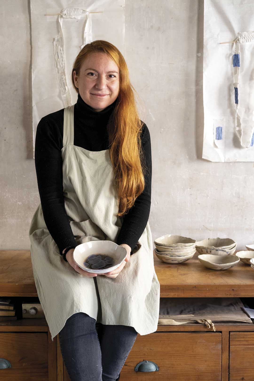 En el pis de dalt del restaurant Mecànic Pizza, tocant la plaça Pep Ventura, on antigament se situava el despatx de la desapareguda fàbrica de baquelita – un plàstic sintètic que es feia servir per a les carcasses de ràdios i telèfons -, un primer pis banyat amb una llum natural ideal per a la creació de les seves peces de ceràmica, Arianna Russo ha traslladat recentment el seu taller. “L’he volgut deixar tal com el vaig trobar”, assegura l’arquitecta, restauradora, artista polifacètica d’origen italià i adopció catalana. Les vigues de fusta del sostre, el sol de formigó, les parets pintades en tons blaus i verds, descolorits pel pas del temps, l’estètica dels anys setanta enalteix les peces de gres i porcellana blanques, creacions d’una fràgil bellesa amb ànima, l’ànima de qui crea amb inquieta passió, en comunicació amb la matèria, deixant que aquesta s’expressi lluirement a les seves mans. “M’interessa portar la matèria al límit, treballar amb diferents materials orgànics i observar les noves formes resultants”, explica en ensenyar-nos les diferents propostes tant de venda al públic com d’exposició. Una feina inspirada en diferents moments de la seva trajectòria professional i personal, en un constant renàixer del seu art.
