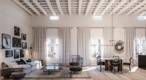 Por esta razón, se decidió emplear el color blanco, tanto para pintar los ladrillos de las paredes como de las vigas, todos ellos elementos rescatados, testigos de una época ya pasada y protagonistas a la vez de estos nuevos espacios que se resistían a perder amplitud y carácter. La incorporación de cuarterones de vidrio transparente y hierro para marcar las divisiones, ayudaron a crear esta sensación de espaciosidad, decorada con mobiliario contemporáneo. De líneas sencillas, éste combina acertadamente materiales como el latón, el hierro y el cobre, con mármoles y hormigón. El toque ecléctico también lo aportan el uso de las pieles en las tapicerías, las fotografías de Jordi Escadell y los obras de Yaya Tur.