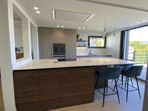 El primer que es va fer per permetre la màxima entrada de llum exterior, va ser ampliar el finestral que connectava la cuina amb la terrassa. Com que les columnes estructurals que separen cuina i menjador no es podien enderrocar, es va optar per una península central, que vertebra l’espai generant al seu voltant dues àmplies vies de pas. Aquesta està composta per un taulell de porcellànic tipo marbre que integra la placa d’inducció, uns endolls superficials i una campana acoblada al sostre, cosa que afavoreix la integració espacial entre menjador i cuina. Un altre atractiu del taulell és que genera una barra amb tamburets on seure distesament a cuinar o fins i tot menjar. La base que sosté el taulell és una elegant zona de color noguera amb quatre nivells d’emmagatzematge, amb la particularitat que el mòdul inferior és un calaix sócol que arriba fins al terra.