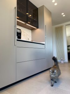 A un costat de la cuina hi ha la zona d’aigües, alineada amb les columnes de les neveres i el forn encastat al mig. La mateixa estructura de columnes amb el característic color gris arena de Santos (la marca de cuines que Boix Interiorisme distribueix a Barcelona) es repeteix a l’altre costat. Entre els armaris verticals d’emmagatzematge apareix encastada la zona d’esmorzar, amb la cafetera i una preciosa vitrina il·luminada amb llums led.