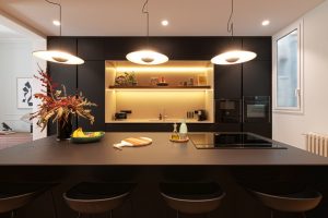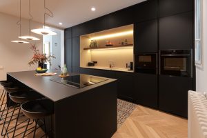 Un cop adquirit aquest pis de l’Eixample barceloní, els seus propietaris van decidir reformar-lo íntegrament. Com que tenien clar que la cuina havia de ser un espai protagonista, van confiar la seva execució a l’experiència i professionalitat de Boix Interiorisme. Des de la primera trobada, van deixar clar que volien una cuina sòbria i elegant, amb predomini de colors foscos.