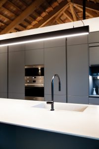 Els acabats estratificats són el resultat d’aplicar la nanotecnologia a les cuines Santos, una de les marques més punteres en innovació i disseny del sector. Un dels seus distribuïdors principals a Barcelona és Boix interiorisme, l’estudi que presenta aquest projecte, resultat de la seva intervenció en dissenyar la cuina d’un projecte de reforma integral d’una antiga masia. Al capdavant de l’equip, Marta Boix va recomanar optar pel mobiliari de la gamma superior LAH en color gris brom i acabat supermate i seda. “Es tracta d’una solució antiditades, que ofereix gran resistència al desgast, a la calor i a la humitat i que en cas de ratllar-se o pintar-se de manera superficial, la marca s’elimina amb aplicació de calor”, explica la interiorista. Com a indiscutible protagonista de l’espai obert que ocupa, integrada al menjador de l’habitatge, l’equip de Boix interiorisme va dissenyar una illa de grans proporcions, amb capacitat d’emmagatzematge pels dos costats. D’estètica minimalista, els tiradors estan integrats a la part superior de cada element, sigui els calaixos o porta del rentavaixella, ubicats davant el frontal de columnes de la cuina, amb la nevera encastada, el microones, el forn i un mòdul per esmorzars amb detall lumínic, o els armaris, per donar servei a la part del menjador. El taulell de cuina de Corian, dona un aspecte visual d’una sola peça, sense juntes, igual que la pica que incorpora, tot jugant amb el sol de microciment de tota la casa. Per acabar, la campana de recirculació, totalment invisible, neix a la placa de cocció, per a més sofisticació. /