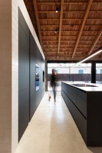 Els acabats estratificats són el resultat d’aplicar la nanotecnologia a les cuines Santos, una de les marques més punteres en innovació i disseny del sector. Un dels seus distribuïdors principals a Barcelona és Boix interiorisme, l’estudi que presenta aquest projecte, resultat de la seva intervenció en dissenyar la cuina d’un projecte de reforma integral d’una antiga masia. Al capdavant de l’equip, Marta Boix va recomanar optar pel mobiliari de la gamma superior LAH en color gris brom i acabat supermate i seda. “Es tracta d’una solució antiditades, que ofereix gran resistència al desgast, a la calor i a la humitat i que en cas de ratllar-se o pintar-se de manera superficial, la marca s’elimina amb aplicació de calor”, explica la interiorista. Com a indiscutible protagonista de l’espai obert que ocupa, integrada al menjador de l’habitatge, l’equip de Boix interiorisme va dissenyar una illa de grans proporcions, amb capacitat d’emmagatzematge pels dos costats. D’estètica minimalista, els tiradors estan integrats a la part superior de cada element, sigui els calaixos o porta del rentavaixella, ubicats davant el frontal de columnes de la cuina, amb la nevera encastada, el microones, el forn i un mòdul per esmorzars amb detall lumínic, o els armaris, per donar servei a la part del menjador. El taulell de cuina de Corian, dona un aspecte visual d’una sola peça, sense juntes, igual que la pica que incorpora, tot jugant amb el sol de microciment de tota la casa. Per acabar, la campana de recirculació, totalment invisible, neix a la placa de cocció, per a més sofisticació. /