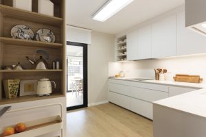 La cuina és de Santos (Boix Interiorisme és distribuïdor oficial a la zona alta) i destaca per la seva pulcritut. Tant els mobles com el taulell de cuina són blancs i les parets, revestides amb paper pintat amb textura, també aporten un plus de calidesa. El contrast el posen el sòl de roure i altres detalls en fusta en el moble alt suspès.