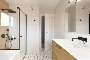 Els banys, un per planta, llueixen amb mobles fets a mida, terres amb una estètica distingida i altres acabats que defineixen una obra de qualitat en tots els elements, incloent-hi l’escala, revestida en fusta sintètica molt resistent, denota una personalitat pròpia, i la barana, en negre, un altre atractiu, que es reprodueix també a la porta d’entrada o les aixetes.