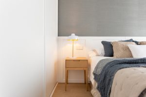 El dormitori incideix en l’estètica minimalista en tons clars. I introdueix com a colors diferenciadors el gris del paper pintat, i el blau dels coixins i els llençols del llit. Tant el capçal, lacat en blanc, com l’armari estan dissenyats a mida per Mobles Boix.