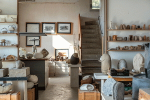 Alçada en un terreny que fa pendent, les impressionants vistes panoràmiques de la Serra de Collserola, els boscos de pins, alzines i roures s’exhibeixen com un tapís natural, compensen la dificultat que aquesta característica comporta per a la mobilitat de les peces en gran format, sigui el material en brut o l’obra acabada, que necessiten grues i un accés factible per al seu transport i manipulació. Costa imaginar-se l’artista renunciar a aquest paratge per a traslladar-se en una nau industrial, on logísticament pensa que seria més adient treballar.