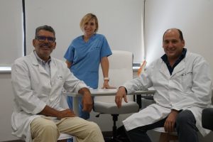 Els doctors Àlex Peiró i Daniel Adan amb l’auxiliar d’infermeria de l’equip, Eli Roig.