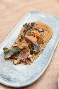 Papada de porc ibèric amb vieires sobre crema de carabassa especiada amb carxofes confitades i xips de nyamera.
