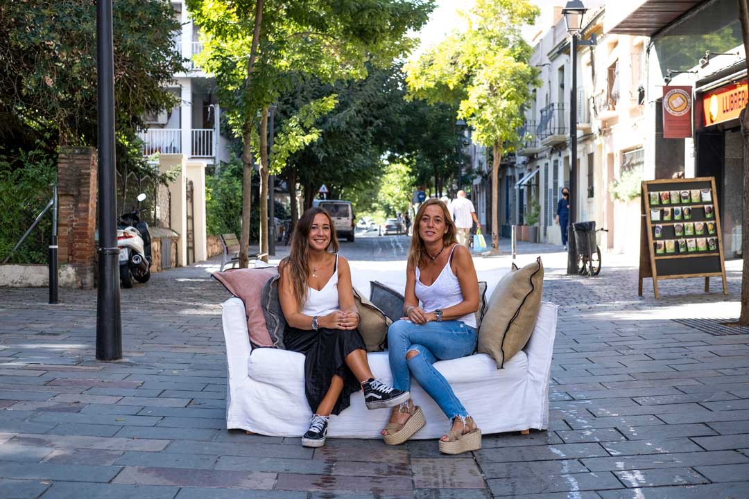 Ester i Mamen Fernández al carrer Villà, a l’alçada d’Ombra, on en un acte d’espontaneïat no buscat, decideixen treure el sofà per deixar-se fotografiar.