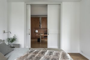 El dormitorio principal integra un despacho con una pieza histórica de Hans J. Wagner. La mesa de madera y acero combina con el panelado de los armarios.