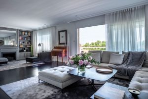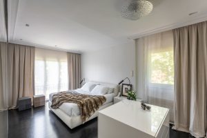 La creatividad unida a la experiencia de Ferruz ha permitido recuperar el pavimento de tarima maciza de roble antiguo, transformando su anacrónico color cerezo original en negro para conseguir la profundidad visual requerida, además de aportar la nota cálida y sofisticada al ambiente. La iluminación ha sido otro de los elementos clave para conseguir la atmósfera deseada, cuyos efectos se ensalzan con la instalación de focos led regulables de resina y escayola rectangulares, así como también con ayuda del mobiliario, la decoración textil y pequeñas modificaciones de obra menor, como la que ha permitido abrir un pequeño despacho anexo al comedor, independiente gracias a una puerta corredera de cristal con perfil de hierro macizo y barniz natural.