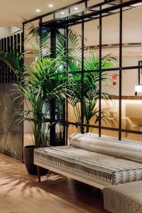 Por su parte, el Hotel Lemon, ubicado en pleno centro histórico, transmite la frescura y la vitalidad de Barcelona con tonos amarillos y verdes inspirados en el trópico y su naturaleza exuberante. El extenso sofá amarillo del recibidor, de la colección Linco, y el contraste que aportan los cojines verdes de la colección Dune, sugieren esa personalidad divertida e impulsiva.
