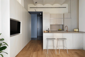 Proyecto Ruzafa _ Este proyecto integral se desarrolla en una vivienda de dimensiones ajustadas dentro de un edificio antiguo en el barrio valenciano de Ruzafa. El reto fue aprovechar al máximo el espacio respetando el pasado de un edificio histórico, sin perder el valor y sensaciones que aportan su notable altura y los techos abovedados. En el desarrollo del proyecto ejecutivo, se recuperaron las baldosas hidráulicas originales que contrastan con los tonos neutros de las zonas de día y noche, persiguiendo una continuidad en las distintas estancias, en las que se integraron zonas de almacenaje para lograr una mayor sensación de espacio y orden cartesiano en esta vivienda que NT ha desarrollado hasta el más mínimo detalle con el fin de unificar un criterio estético: desde el concepto inicial, hasta el mobiliario, la iluminación y los complementos. /