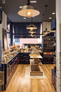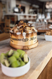 Las tablas de queso incluyen una selección que el cliente pude llevarse a casa, al pasar por la tienda. El plato icónico de la Quesería consiste en una innovadora receta de queso Mont-d’Or fundido al horno con una variedad de setas de temporada y maridado con vino blanco.