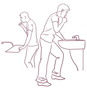 A lavarnos los dientes y la cara es importante flexionar un poco las rodillas, de manera que flexionaremos la rodilla contraria a la mano que sujeta el cepillo y apoyaremos la mano libre en el lavabo.