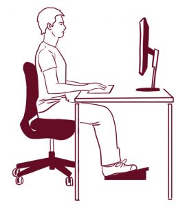 Delante del ordenador, mantendremos una postura cómoda, con una silla que de soporte a la espalda, especialmente a la zona lumbar, ajustada a una altura que permita su relajación, el monitor centrado y a una distancia igual o superior a la longitud de un brazo, el extremo superior de la pantalla a la altura de los ojos, teclado enfrente nuestro, sin que las muñecas se apoyen al usarlo, el ratón cerca de él, y los codos en un ángulo de 90 grados.