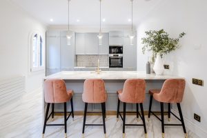 Los sillones tapizados en terciopelo salmón aportan calidez y reafirma la sensación de sofisticación del espacio.