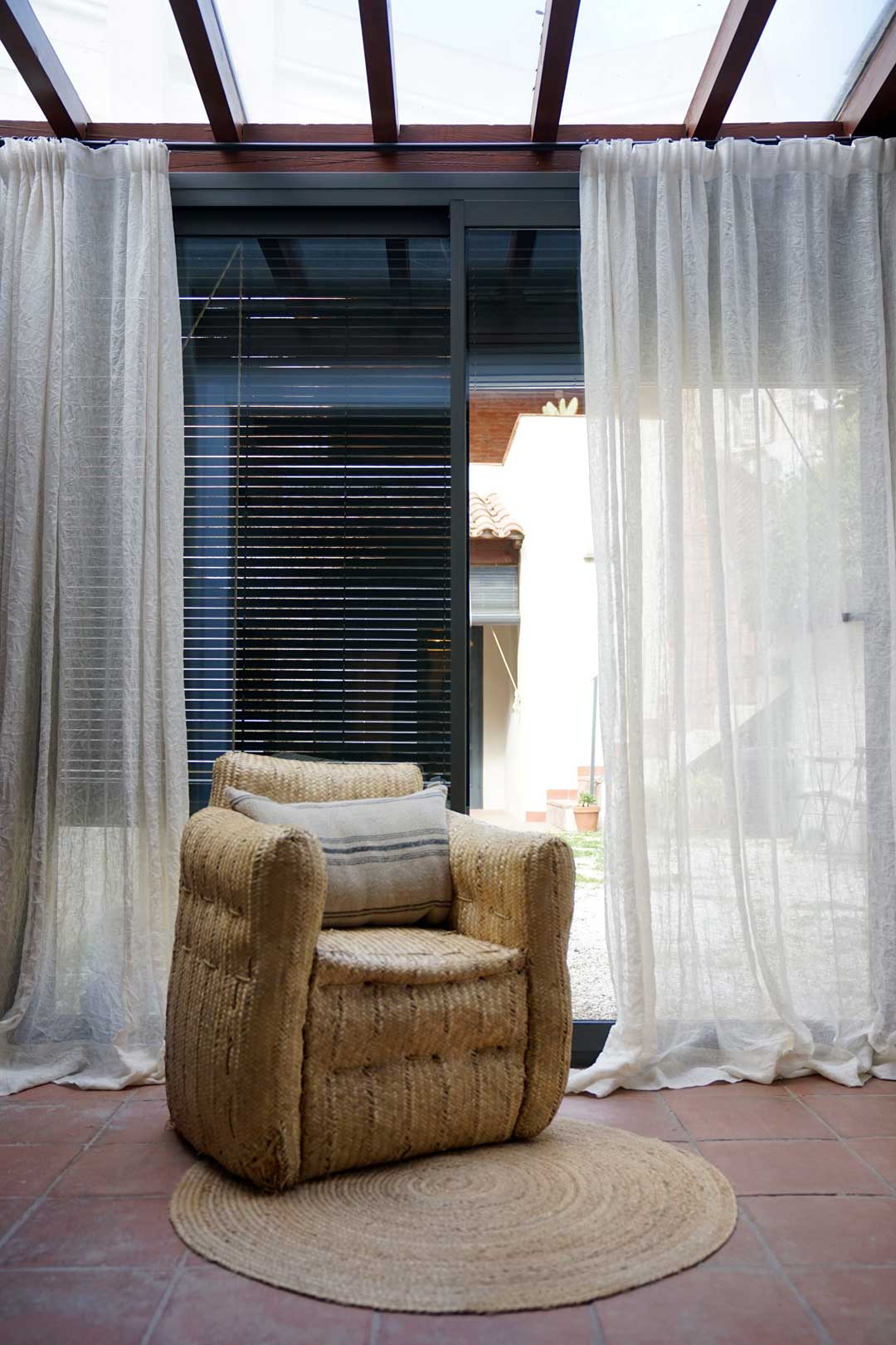 En coherència amb l’estil rústic de la construcció, les persianes alicantines es complementen amb cortines de lli 100% natural amb acabat arrugat.