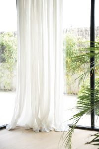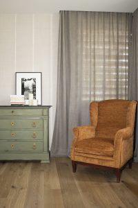 A l’habitació principal, les cortines seleccionades harmonitzen perfectament amb el paper pintat i una butaca antiga entapissada, creant un ambient acollidor i elegant. L’entrada de la casa llueix una majestuosa cortina de lli blanc, afegint un toc de sofisticació. Ridox també es va encarregar de la confecció i instal·lació de les cortines i el paper pintat en altres espais de la casa, com el porxo, les habitacions infantils, el safareig i els banys.
