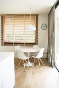 Per al saló i la cuina, es va triar la mateixa tela, la qual cosa va permetre mantenir una continuïtat visual al llarg dels 25 metres de façana. La cuina, a més, es va complementar amb una veneciana de fusta natural, en sintonia amb el sòl, amb el seu sistema ideal per a regular l’entrada de llum.