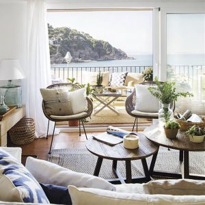 Una terrassa ben decorada ajuda a crear un ambient agradable i acollidor, convertint-la en el lloc ideal per descansar i gaudir a l’aire lliure. Per decorar-la adequadament, començarem per mesurar l’espai. Com normalment sol tenir poca profunditat, en escollir la taula, haurem de tenir en compte el perímetre que deixarem al seu voltant per poder-nos moure amb llibertat (70 cm, mínim), substituint algunes de les cadires per un banc encastat a una paret, en cas necessari. Una opció que també funciona quan no disposem d’una gran superfície és col·locar un parell de butaques d’exterior individuals amb teixits sintètics que no pateixin per la pluja ni el sol. Els encararem cap a l’exterior, sempre que les baranes ens permetin veure’l, o cap a l’interior, en el cas que la vista sigui millor, i posarem una catifa per integrar els dos ambients. Una vegada tenim el mobiliari, ens centrarem en la vegetació. Si no tens facilitat per les plantes i vols un consell més pràctic, escull la mateixa planta d’un verd homogeni, de fulla perenne, clima mediterrani i sense flor, i instal·la un sistema de reg automàtic per despreocupar-te.