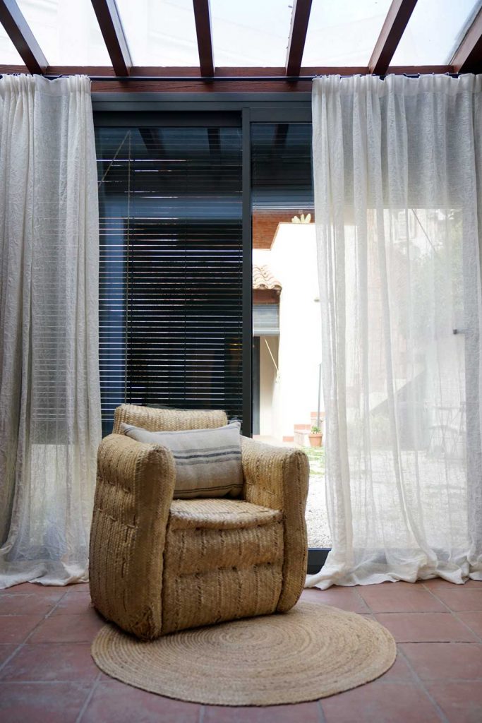 En coherència amb l’estil rústic de la construcció, les persianes alicantines es complementen amb cortines de lli 100% natural amb acabat arrugat.
